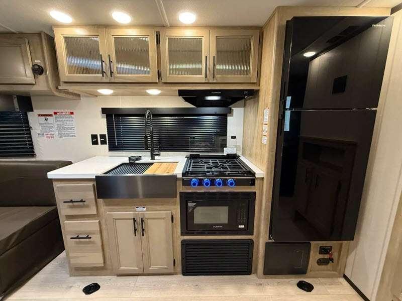 Sleeps 4 Length 33 ft 3 in Ext Width 8 ft Ext Height 10 ft 8 in Int Height 0 ft Hitch Weight 989 lbs GVWR 7989 lbs Dry Weight 6412 lbs Cargo Capacity 1577 lbs Fresh Water Capacity 52 gals Grey Water Capacity 38 gals Black Water Capacity 38 gals Furnace BTU 20000 btu Available Beds RV King Refrigerator Type 12V Cooktop Burners 3 Number of Awnings 1 Garage Size 13 ft Water Heater Type Tankless AC BTU 15000 btu Awning Info 15' Full Length Power w/LED Light Strip Axle Count 2 Shower Type Standard Solar Wattage 200 watts Similar Floorplans