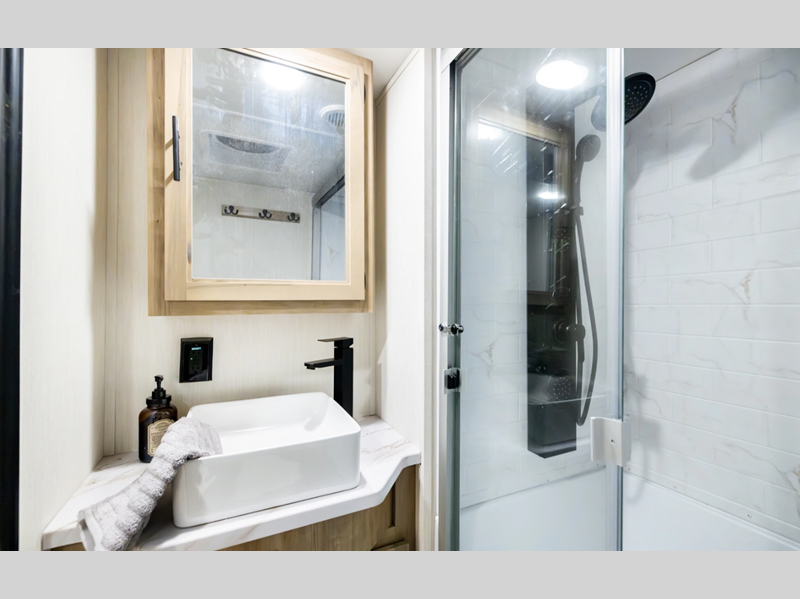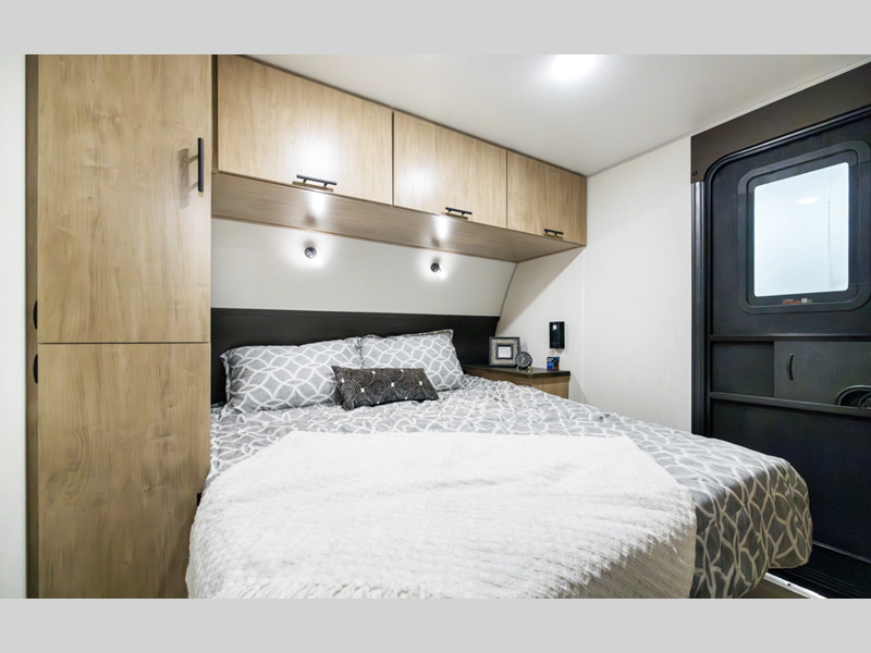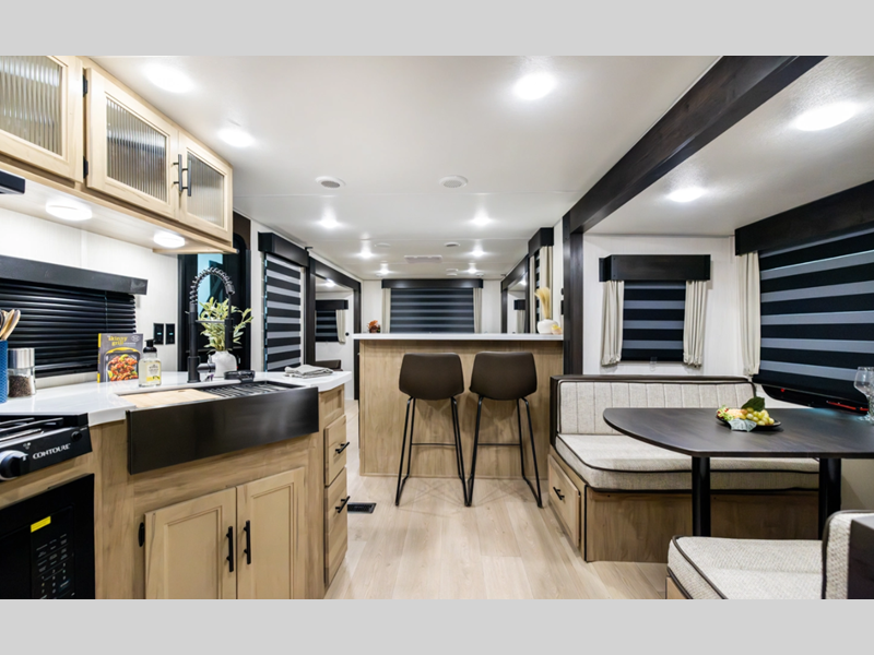 The Black Label differs from the standard Wolf Den, in that there are fiberglass gel coated fiberglass sided walls, frameless windows, and thermo-foil arctic insulation. You'll also enjoy solid surface countertops, upgraded reading lights, and designer cushion fabric! Each model features comfortable seating and sleeping spaces, full bath and kitchen amenities to make life at the campground easier than ever, plus plenty of storage space for personal belongings, camp gear and more!