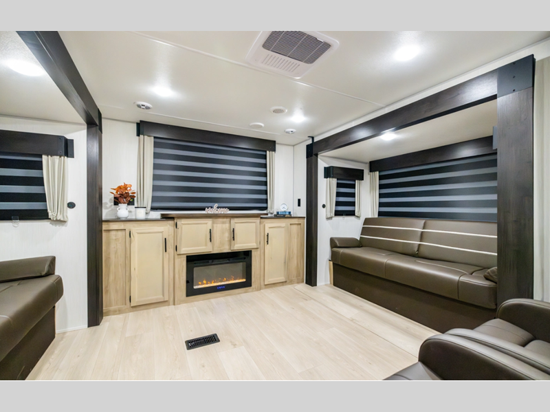 Sleeps 4 Slides 2 Length 33 ft 4 in Ext Width 8 ft Ext Height 11 ft 1 in Hitch Weight 830 lbs GVWR 9985 lbs Dry Weight 7489 lbs Cargo Capacity 2496 lbs Fresh Water Capacity 52 gals Grey Water Capacity 38 gals Black Water Capacity 38 gals Available Beds RV King Cooktop Burners 3 Number of Awnings 1 Awning Info 21' Axle Count 2 Shower Type Neo-Angled Similar Floorplans
